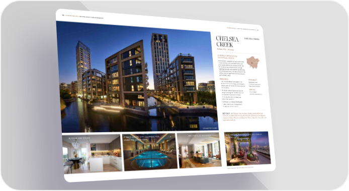 28 | PORTFOLIO 2024 GREATER LONDON DEVELOPMENTS PORTFOLIO 2024 GREATER LONDON DEVELOPMENTS | 29 CHELSEA CREEK Fulham, SW6 – St George EUROPEAN-STYLE LIVING IN CENTRAL LONDON Chelsea Creek - designed by Squire & Partners 9 - is home to luxurious canalside homes and an enviable collection of residents’ amenities. The contemporary homes are set amongst tree-lined avenues and meandering waterways, with the famous luxury retailers and acclaimed restaurants of King’s Road and Sloane Square just moments away. HIGHLIGHTS AVAILABILITY – Hotel-style facilities in the Halycon Club Manhattan, 1 and include a 24-hour concierge, swimming pool, 2 bedroom apartments. cinema, spa with sauna and steam room and Prices from £805,000 fitness centre CONTACT – The King’s Tower will provide a residents’ lounge, meeting room and 31st floor roof 020 3918 4677 terrace with views towards the city www.chelseacreek.co.uk – Set alongside canal waterways and landscaped gardens – 16,000 sq ft commercial/retail space – Only a short stroll to Imperial Wharf Overground station (zone 2) KEY FACT At Chelsea Creek, we have created London’s 昀椀rst new network of canals and waterways in 100 years. Home to art sculptures: Swooping House Martins and Space for Nature Spiral by Tanya Russell and Lorne McKean. CANALSIDE LIVING KITCHEN AND DINING FITNESS CENTRE WITH SWIMMING POOL, HALCYON CLUB, RESIDENTS’ LOUNGE HALCYON CLUB, ROOFTOP LOUNGE AND TERRACE SAUNA AND STEAM ROOM WITH CITY VIEWS Computer-generated images and photography are indicative only.